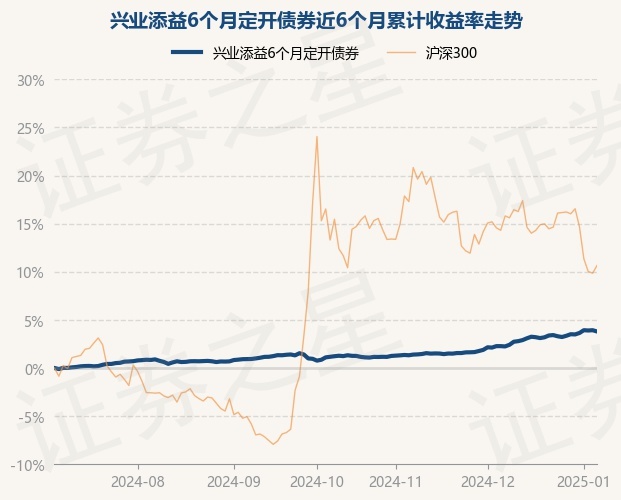 证券之星消息,1月6日,兴业添益6个月定开债券最新单位净值为1.0423元,累计净值为1.1013元,较前一交易日上涨0.03%。历史数据显示该基金近1个月上涨1.65%,近3个月上涨2.94%,近6个月上涨3.93%,近1年上涨6.77%。该基金近6个月的累计收益率走势如下图: