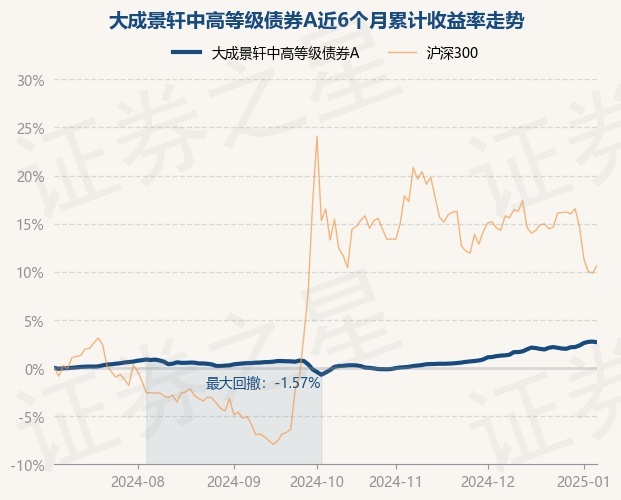 证券之星消息,1月6日,大成景轩中高等级债券A最新单位净值为1.1231元,累计净值为1.1681元,较前一交易日上涨0.03%。历史数据显示该基金近1个月上涨1.41%,近3个月上涨2.89%,近6个月上涨2.74%,近1年上涨6.45%。该基金近6个月的累计收益率走势如下图: