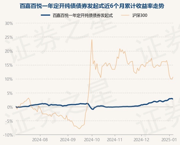 证券之星消息,1月7日,百嘉百悦一年定开纯债债券发起式最新单位净值为1.0466元,累计净值为1.0772元,较前一交易日下跌0.18%。历史数据显示该基金近1个月上涨1.91%,近3个月上涨3.06%,近6个月上涨2.75%,近1年上涨6.11%。该基金近6个月的累计收益率走势如下图:
