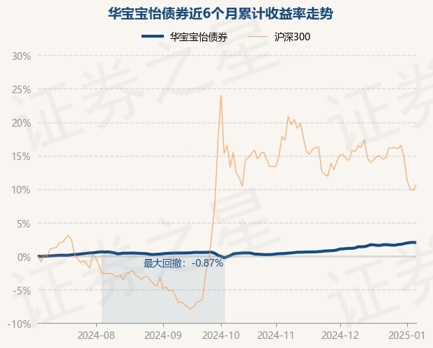 证券之星消息,1月7日,华宝宝怡债券最新单位净值为1.0873元,累计净值为1.2051元,较前一交易日下跌0.06%。历史数据显示该基金近1个月上涨0.83%,近3个月上涨1.89%,近6个月上涨2.01%,近1年上涨4.08%。该基金近6个月的累计收益率走势如下图: