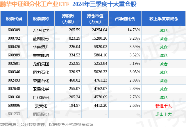 鹏华中证细分化工产业ETF为指数型-股票基金,根据最新一期基金季报显示,该基金资产配置:股票占净值比99.06%,无债券类资产,现金占净值比0.23%。基金十大重仓股如下: