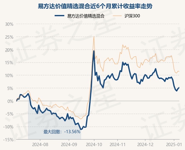 证券之星消息,1月8日,易方达价值精选混合最新单位净值为1.0963元,累计净值为3.8053元,较前一交易日上涨0.38%。历史数据显示该基金近1个月下跌4.26%,近3个月下跌11.96%,近6个月上涨5.14%,近1年上涨5.47%。该基金近6个月的累计收益率走势如下图: