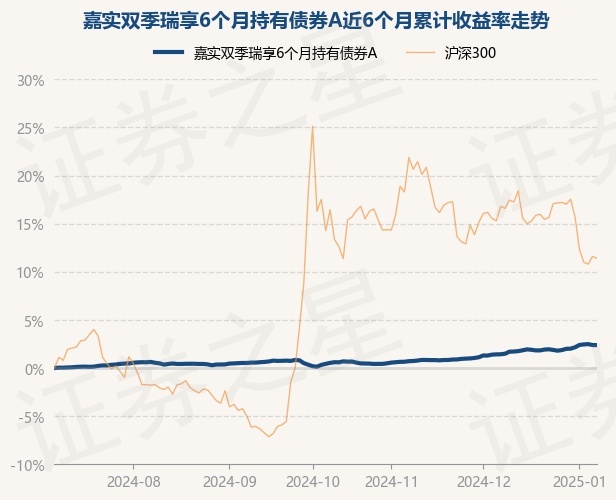 嘉实双季瑞享6个月持有债券A为债券型-混合一级基金,根据最新一期基金季报显示,该基金资产配置:无股票类资产,债券占净值比96.96%,现金占净值比1.07%。