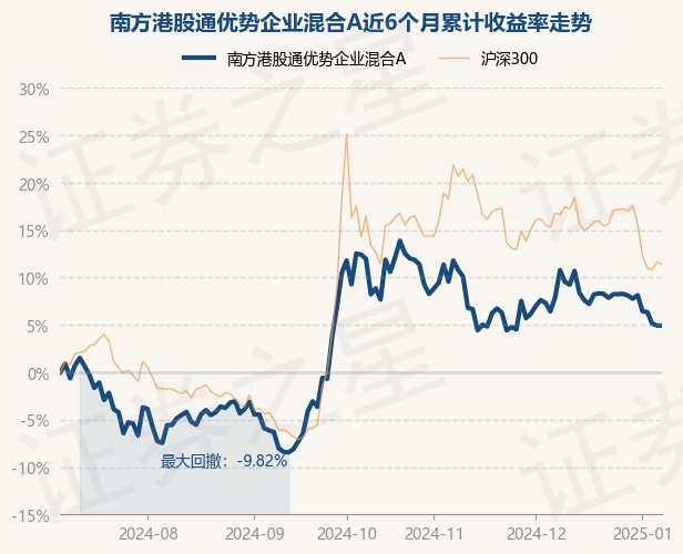证券之星消息,1月8日,南方港股通优势企业混合A最新单位净值为0.7926元,累计净值为0.7926元,较前一交易日上涨0.0%。历史数据显示该基金近1个月下跌3.59%,近3个月下跌6.93%,近6个月上涨4.04%,近1年上涨14.26%。该基金近6个月的累计收益率走势如下图: