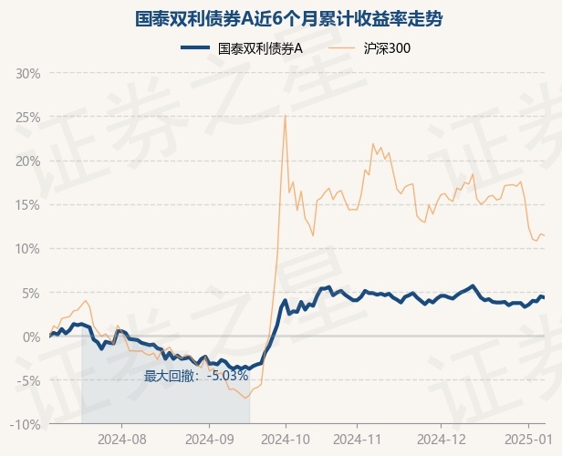 证券之星消息,1月8日,国泰双利债券A最新单位净值为1.657元,累计净值为2.077元,较前一交易日下跌0.12%。历史数据显示该基金近1个月下跌0.24%,近3个月上涨0.3%,近6个月上涨4.35%,近1年上涨8.8%。该基金近6个月的累计收益率走势如下图: