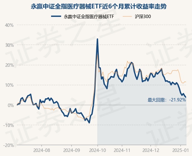 证券之星消息,1月8日,永赢中证全指医疗器械ETF最新单位净值为0.4645元,累计净值为0.4645元,较前一交易日下跌0.64%。历史数据显示该基金近1个月下跌10.74%,近3个月下跌21.92%,近6个月上涨3.75%,近1年下跌13.52%。该基金近6个月的累计收益率走势如下图: