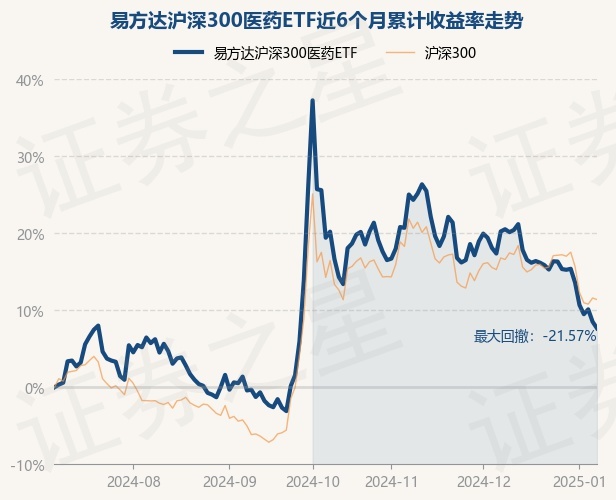 证券之星消息,1月8日,易方达沪深300医药ETF最新单位净值为0.3415元,累计净值为1.366元,较前一交易日下跌0.78%。历史数据显示该基金近1个月下跌10.46%,近3个月下跌21.57%,近6个月上涨7.66%,近1年下跌12.23%。该基金近6个月的累计收益率走势如下图: