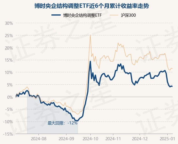 证券之星消息,1月8日,博时央企结构调整ETF最新单位净值为1.2697元,累计净值为1.3085元,较前一交易日下跌0.08%。历史数据显示该基金近1个月下跌3.96%,近3个月下跌8.86%,近6个月上涨4.23%,近1年上涨15.26%。该基金近6个月的累计收益率走势如下图: