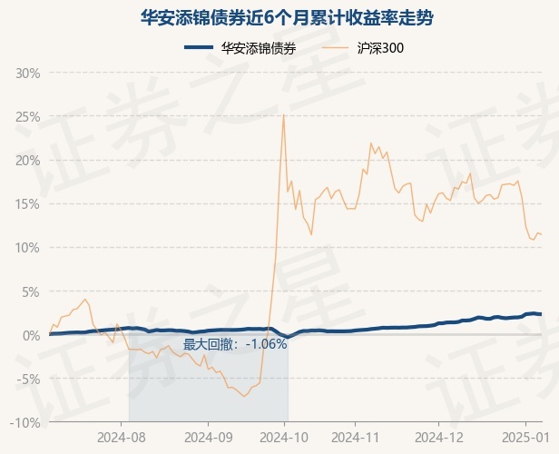 证券之星消息,1月8日,华安添锦债券最新单位净值为1.058元,累计净值为1.076元,较前一交易日下跌0.01%。历史数据显示该基金近1个月上涨0.93%,近3个月上涨2.45%,近6个月上涨2.29%,近1年上涨4.71%。该基金近6个月的累计收益率走势如下图: