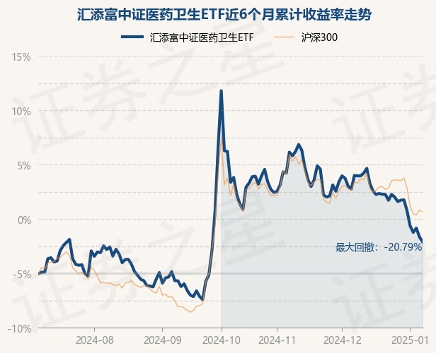 证券之星消息,1月8日,汇添富中证医药卫生ETF最新单位净值为1.2021元,累计净值为1.2021元,较前一交易日下跌0.84%。历史数据显示该基金近1个月下跌10.33%,近3个月下跌20.79%,近6个月上涨5.83%,近1年下跌12.76%。该基金近6个月的累计收益率走势如下图: