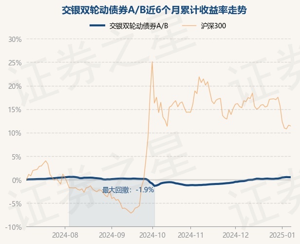 证券之星消息,1月8日,交银双轮动债券A/B最新单位净值为1.0743元,累计净值为1.5193元,较前一交易日上涨0.0%。历史数据显示该基金近1个月上涨0.83%,近3个月上涨1.37%,近6个月上涨0.51%,近1年上涨2.7%。该基金近6个月的累计收益率走势如下图: