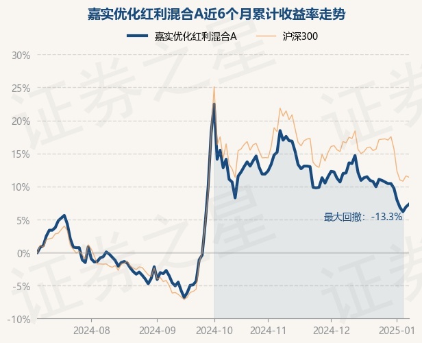 证券之星消息,1月8日,嘉实优化红利混合A最新单位净值为1.337元,累计净值为3.223元,较前一交易日上涨0.38%。历史数据显示该基金近1个月下跌4.16%,近3个月下跌12.39%,近6个月上涨7.3%,近1年上涨5.28%。该基金近6个月的累计收益率走势如下图: