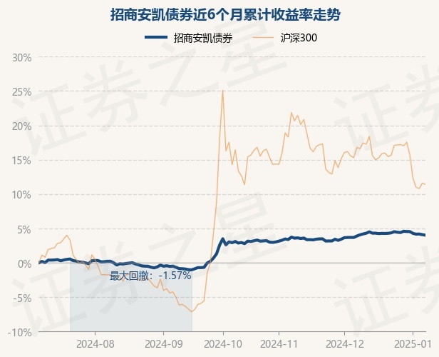 证券之星消息,1月8日,招商安凯债券最新单位净值为1.0307元,累计净值为1.1284元,较前一交易日下跌0.08%。历史数据显示该基金近1个月上涨2.65%,近3个月上涨0.5%,近6个月上涨4.01%,近1年上涨10.21%。该基金近6个月的累计收益率走势如下图:
