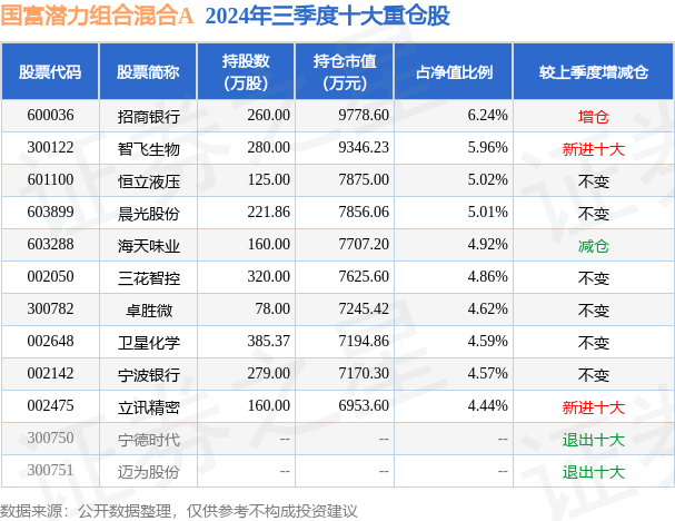 国富潜力组合混合A为混合型-偏股基金,根据最新一期基金季报显示,该基金资产配置:股票占净值比94.06%,债券占净值比5.35%,现金占净值比3.26%。基金十大重仓股如下: