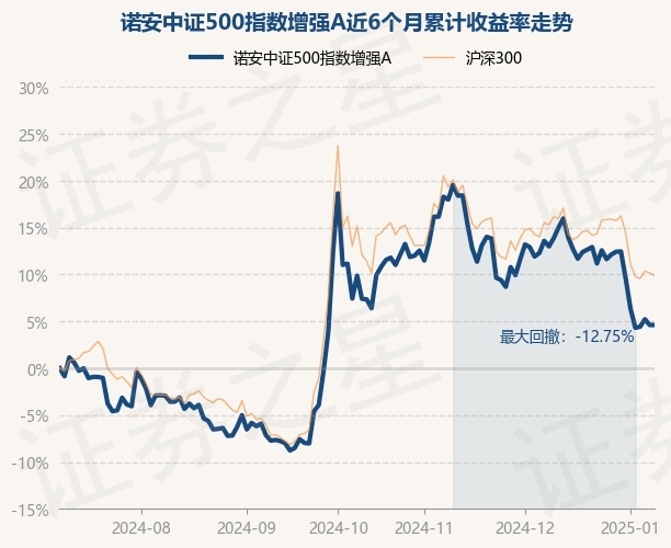 证券之星消息,1月9日,诺安中证500指数增强A最新单位净值为0.8015元,累计净值为0.8015元,较前一交易日上涨0.0%。历史数据显示该基金近1个月下跌7.42%,近3个月下跌5.77%,近6个月上涨4.61%,近1年下跌2.2%。该基金近6个月的累计收益率走势如下图: