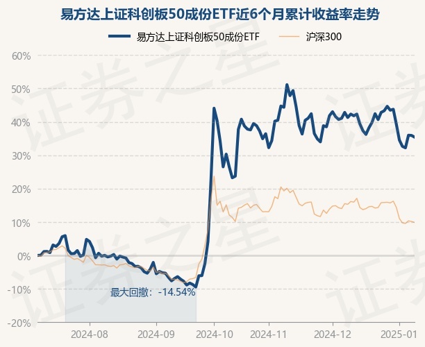 证券之星消息,1月9日,易方达上证科创板50成份ETF最新单位净值为0.985元,累计净值为0.6901元,较前一交易日下跌0.37%。历史数据显示该基金近1个月下跌4.15%,近3个月下跌3.54%,近6个月上涨35.41%,近1年上涨22.82%。该基金近6个月的累计收益率走势如下图:
