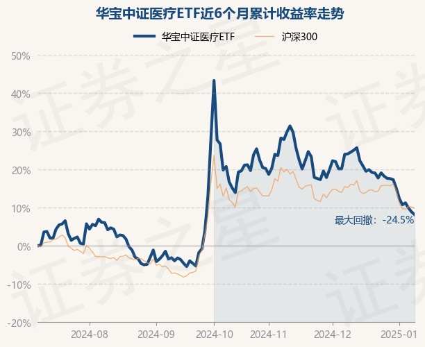 证券之星消息,1月9日,华宝中证医疗ETF最新单位净值为0.3072元,累计净值为0.9216元,较前一交易日下跌0.65%。历史数据显示该基金近1个月下跌12.8%,近3个月下跌15.3%,近6个月上涨8.21%,近1年下跌16.79%。该基金近6个月的累计收益率走势如下图: