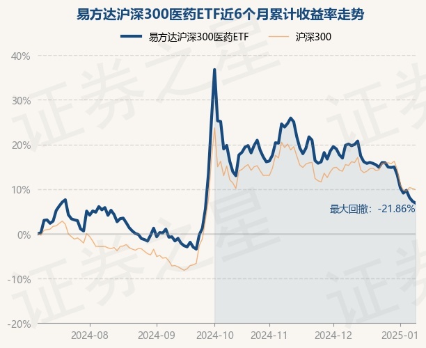 证券之星消息,1月9日,易方达沪深300医药ETF最新单位净值为0.3402元,累计净值为1.3608元,较前一交易日下跌0.38%。历史数据显示该基金近1个月下跌11.01%,近3个月下跌14.69%,近6个月上涨6.88%,近1年下跌12.7%。该基金近6个月的累计收益率走势如下图:
