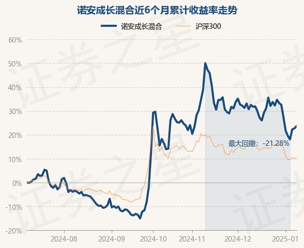 证券之星消息,1月9日,诺安成长混合最新单位净值为1.34元,累计净值为1.785元,较前一交易日上涨0.75%。历史数据显示该基金近1个月下跌5.43%,近3个月下跌4.69%,近6个月上涨23.62%,近1年上涨20.29%。该基金近6个月的累计收益率走势如下图:
