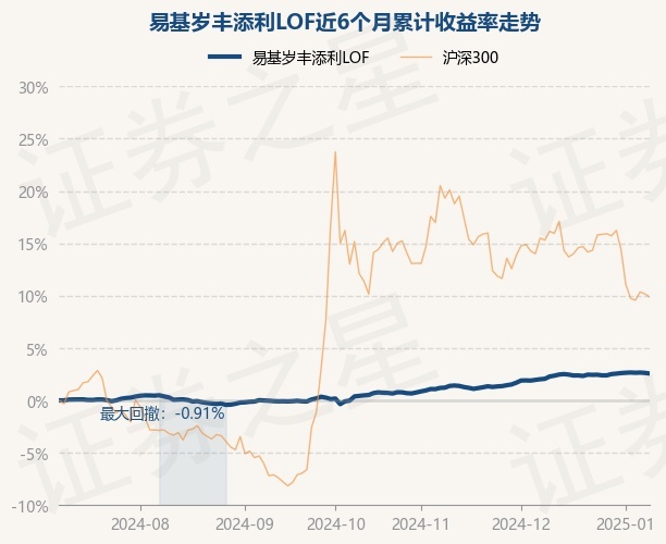 证券之星消息,1月9日,易基岁丰添利LOF最新单位净值为1.6896元,累计净值为2.6006元,较前一交易日下跌0.06%。历史数据显示该基金近1个月上涨0.49%,近3个月上涨2.93%,近6个月上涨2.57%,近1年上涨5.82%。该基金近6个月的累计收益率走势如下图: