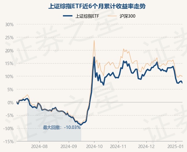 证券之星消息,1月9日,上证综指ETF最新单位净值为0.782元,累计净值为1.638元,较前一交易日下跌0.64%。历史数据显示该基金近1个月下跌5.21%,近3个月下跌2.01%,近6个月上涨7.42%,近1年上涨9.99%。该基金近6个月的累计收益率走势如下图: