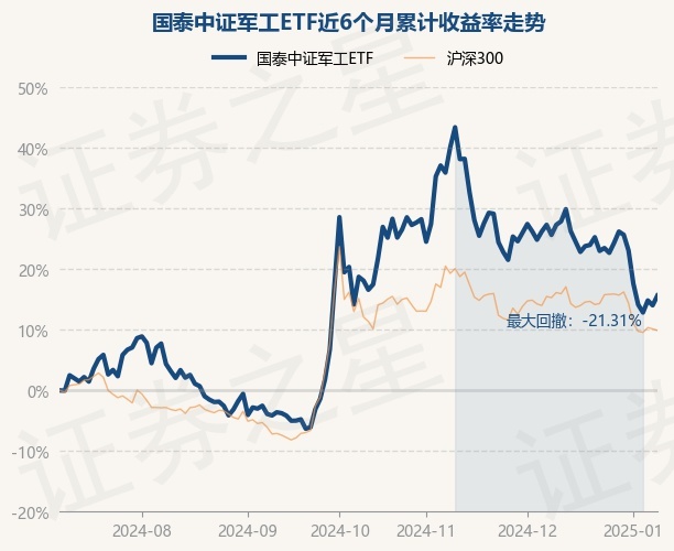 证券之星消息,1月9日,国泰中证军工ETF最新单位净值为0.9787元,累计净值为0.9787元,较前一交易日上涨1.41%。历史数据显示该基金近1个月下跌7.97%,近3个月下跌3.21%,近6个月上涨15.64%,近1年上涨10.88%。该基金近6个月的累计收益率走势如下图: