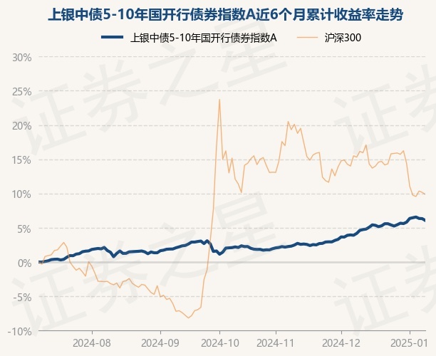证券之星消息,1月9日,上银中债5-10年国开行债券指数A最新单位净值为1.128元,累计净值为1.211元,较前一交易日下跌0.25%。历史数据显示该基金近1个月上涨1.81%,近3个月上涨4.57%,近6个月上涨6.07%,近1年上涨11.2%。该基金近6个月的累计收益率走势如下图: