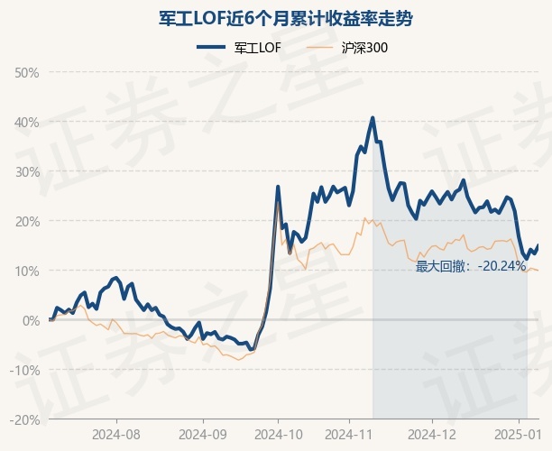 证券之星消息,1月9日,军工LOF最新单位净值为0.968元,累计净值为1.7元,较前一交易日上涨1.36%。历史数据显示该基金近1个月下跌7.55%,近3个月下跌3.01%,近6个月上涨14.83%,近1年上涨10.13%。该基金近6个月的累计收益率走势如下图: