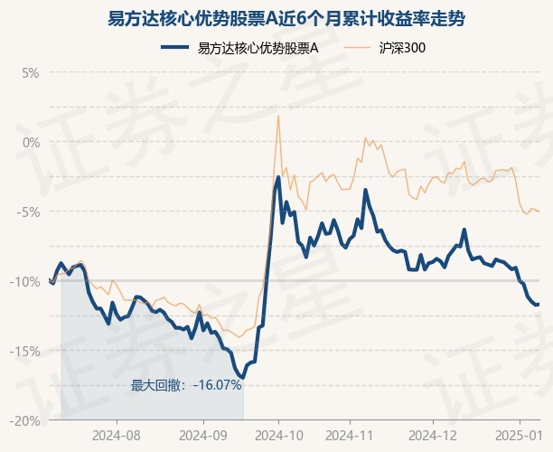 证券之星消息,1月9日,易方达核心优势股票A最新单位净值为0.6473元,累计净值为0.6473元,较前一交易日上涨0.08%。历史数据显示该基金近1个月下跌7.37%,近3个月下跌10.8%,近6个月下跌3.43%,近1年上涨2.55%。该基金近6个月的累计收益率走势如下图: