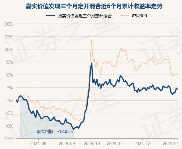 证券之星消息,1月9日,嘉实价值发现三个月定开混合最新单位净值为0.9625元,累计净值为1.0604元,较前一交易日下跌0.17%。历史数据显示该基金近1个月下跌0.18%,近3个月下跌2.33%,近6个月上涨4.32%,近1年上涨16.03%。该基金近6个月的累计收益率走势如下图: