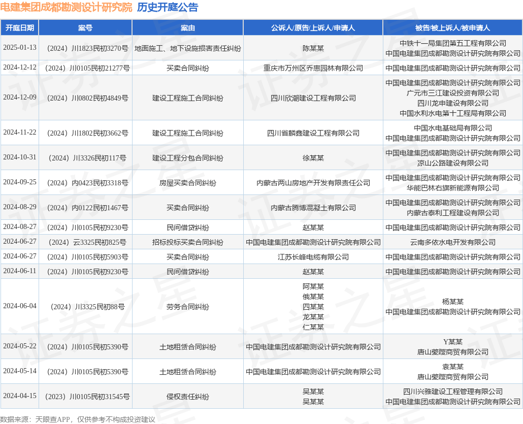 证券之星消息,根据天眼查APP显示,近日公布了一则中国电建集团成都勘测设计研究院有限公司作为被告/被上诉人的开庭公告,详细内容如下: