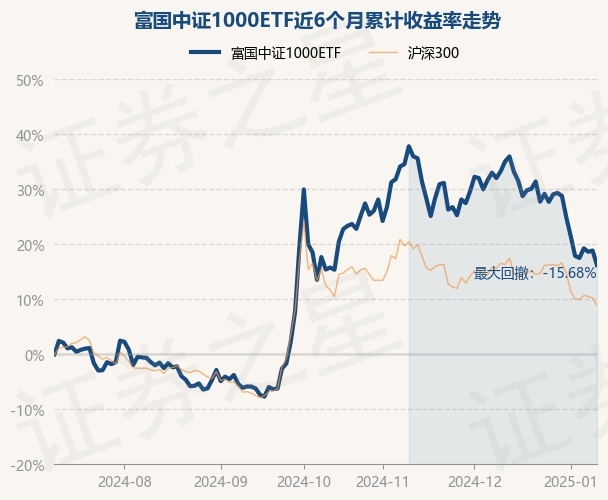 证券之星消息,1月10日,富国中证1000ETF最新单位净值为2.2523元,累计净值为0.793元,较前一交易日下跌2.24%。历史数据显示该基金近1个月下跌12.81%,近3个月下跌1.94%,近6个月上涨16.21%,近1年上涨1.61%。该基金近6个月的累计收益率走势如下图: