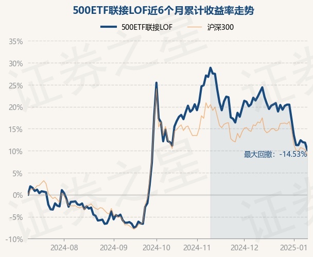 证券之星消息,1月10日,500ETF联接LOF最新单位净值为1.5072元,累计净值为1.6072元,较前一交易日下跌1.51%。历史数据显示该基金近1个月下跌9.95%,近3个月下跌5.43%,近6个月上涨10.14%,近1年上涨5.08%。该基金近6个月的累计收益率走势如下图: