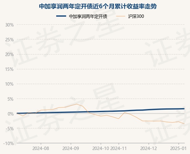 证券之星消息,1月10日,中加享润两年定开债最新单位净值为1.0057元,累计净值为1.1432元,较前一交易日上涨0.05%。历史数据显示该基金近1个月上涨0.31%,近3个月上涨0.99%,近6个月上涨1.55%,近1年上涨2.73%。该基金近6个月的累计收益率走势如下图: