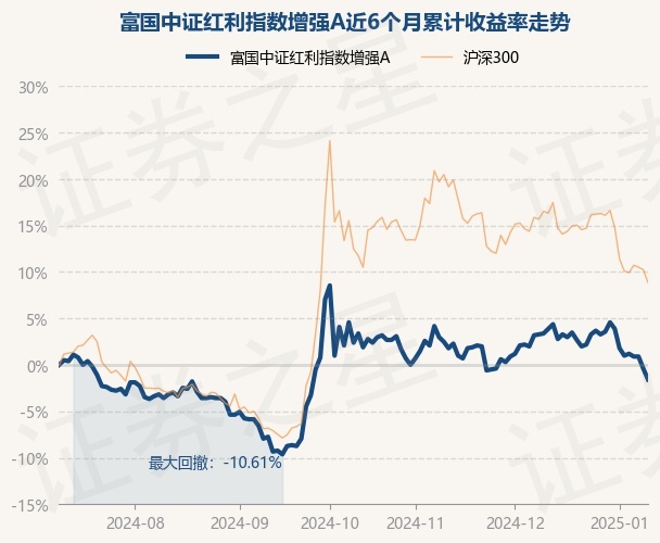 证券之星消息,1月10日,富国中证红利指数增强A最新单位净值为0.991元,累计净值为3.155元,较前一交易日下跌1.2%。历史数据显示该基金近1个月下跌4.8%,近3个月下跌5.44%,近6个月下跌1.59%,近1年上涨4.63%。该基金近6个月的累计收益率走势如下图: