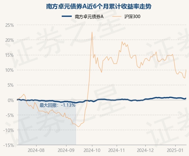 证券之星消息,1月13日,南方卓元债券A最新单位净值为1.0783元,累计净值为1.3557元,较前一交易日下跌0.06%。历史数据显示该基金近1个月下跌0.37%,近3个月上涨0.53%,近6个月上涨0.31%,近1年上涨3.64%。该基金近6个月的累计收益率走势如下图: