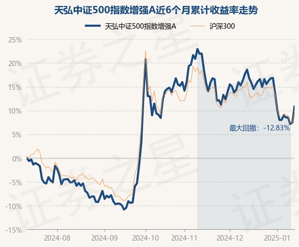证券之星消息,1月14日,天弘中证500指数增强A最新单位净值为1.1394元,累计净值为1.1394元,较前一交易日上涨3.2%。历史数据显示该基金近1个月下跌5.09%,近3个月下跌0.55%,近6个月上涨10.85%,近1年上涨11.69%。该基金近6个月的累计收益率走势如下图: