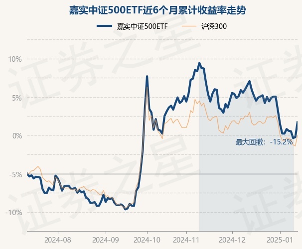 证券之星消息,1月14日,嘉实中证500ETF最新单位净值为2.2242元,累计净值为1.8433元,较前一交易日上涨3.54%。历史数据显示该基金近1个月下跌6.95%,近3个月下跌0.79%,近6个月上涨13.33%,近1年上涨8.39%。该基金近6个月的累计收益率走势如下图: