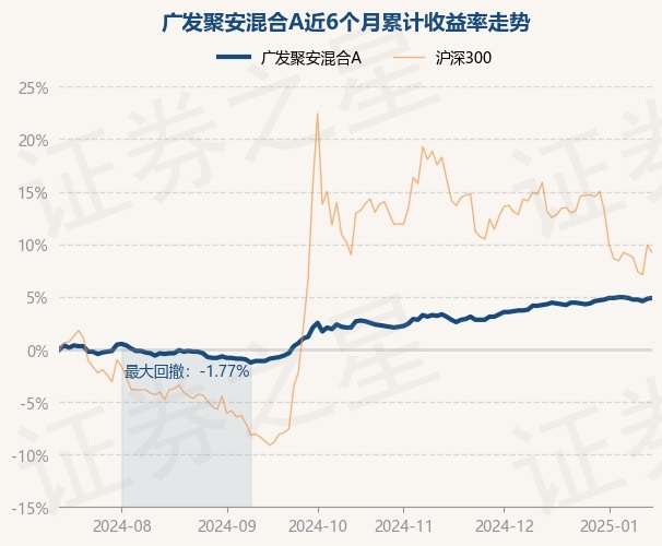 证券之星消息,1月15日,广发聚安混合A最新单位净值为1.417元,累计净值为1.831元,较前一交易日上涨0.07%。历史数据显示该基金近1个月上涨0.57%,近3个月上涨2.68%,近6个月上涨4.89%,近1年上涨8.92%。该基金近6个月的累计收益率走势如下图: