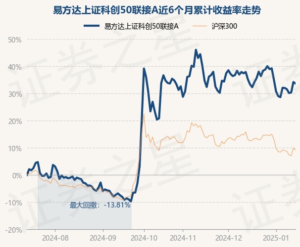 证券之星消息,1月15日,易方达上证科创50联接A最新单位净值为0.7641元,累计净值为0.7641元,较前一交易日下跌0.4%。历史数据显示该基金近1个月下跌1.14%,近3个月上涨8.28%,近6个月上涨33.68%,近1年上涨24.39%。该基金近6个月的累计收益率走势如下图: