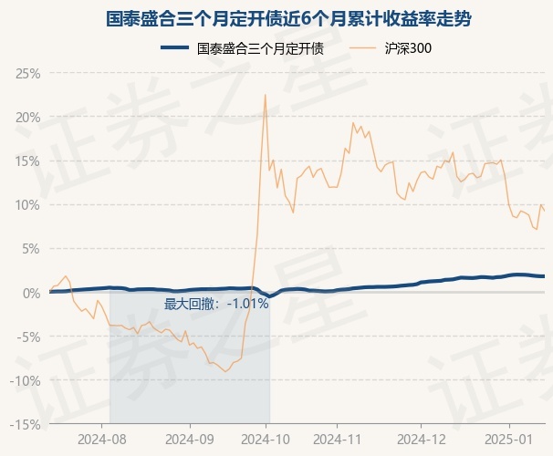 证券之星消息,1月15日,国泰盛合三个月定开债最新单位净值为1.1322元,累计净值为1.1821元,较前一交易日上涨0.0%。历史数据显示该基金近1个月上涨0.25%,近3个月上涨1.53%,近6个月上涨1.76%,近1年上涨4.35%。该基金近6个月的累计收益率走势如下图: