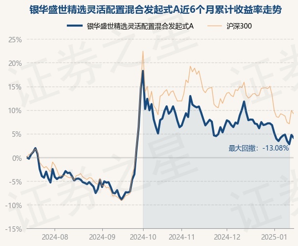 证券之星消息,1月15日,银华盛世精选灵活配置混合发起式A最新单位净值为1.5181元,累计净值为2.0042元,较前一交易日下跌0.56%。历史数据显示该基金近1个月下跌4.89%,近3个月下跌3.6%,近6个月上涨4.16%,近1年上涨1.91%。该基金近6个月的累计收益率走势如下图: