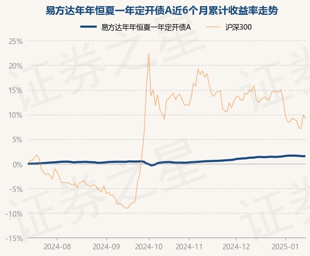 证券之星消息,1月15日,易方达年年恒夏一年定开债A最新单位净值为1.0115元,累计净值为1.2194元,较前一交易日上涨0.01%。历史数据显示该基金近1个月上涨0.21%,近3个月上涨1.33%,近6个月上涨1.55%,近1年上涨4.02%。该基金近6个月的累计收益率走势如下图: