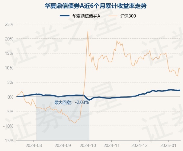 证券之星消息,1月15日,华夏鼎信债券A最新单位净值为1.0592元,累计净值为1.1746元,较前一交易日上涨0.01%。历史数据显示该基金近1个月上涨0.39%,近3个月上涨2.54%,近6个月上涨2.2%,近1年上涨5.46%。该基金近6个月的累计收益率走势如下图: