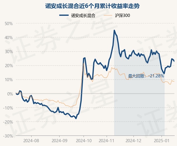 证券之星消息,1月16日,诺安成长混合最新单位净值为1.379元,累计净值为1.824元,较前一交易日下跌0.93%。历史数据显示该基金近1个月上涨0.07%,近3个月上涨11.66%,近6个月上涨22.91%,近1年上涨25.02%。该基金近6个月的累计收益率走势如下图: