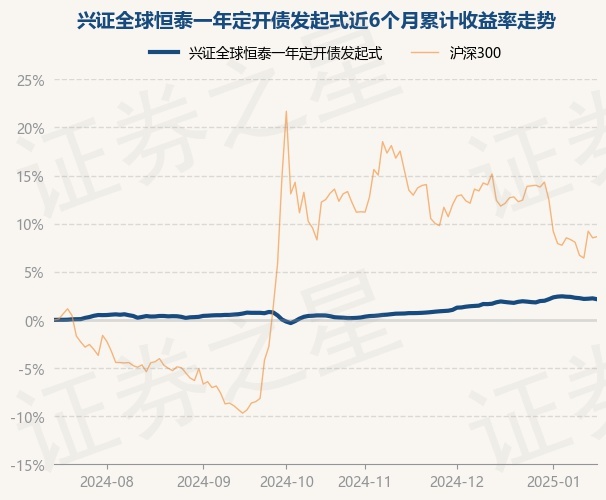 证券之星消息,1月16日,兴证全球恒泰一年定开债发起式最新单位净值为1.0174元,累计净值为1.0943元,较前一交易日下跌0.09%。历史数据显示该基金近1个月上涨0.23%,近3个月上涨1.72%,近6个月上涨2.15%,近1年上涨4.84%。该基金近6个月的累计收益率走势如下图: