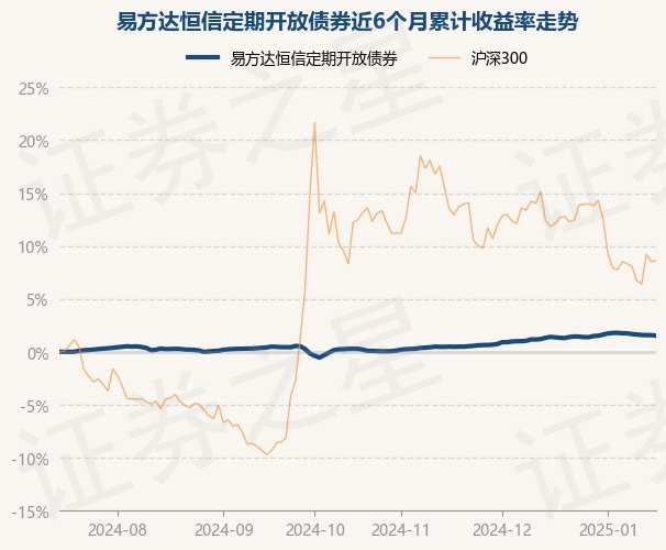 证券之星消息,1月16日,易方达恒信定期开放债券最新单位净值为1.0352元,累计净值为1.2742元,较前一交易日下跌0.06%。历史数据显示该基金近1个月上涨0.11%,近3个月上涨1.27%,近6个月上涨1.52%,近1年上涨4.26%。该基金近6个月的累计收益率走势如下图: