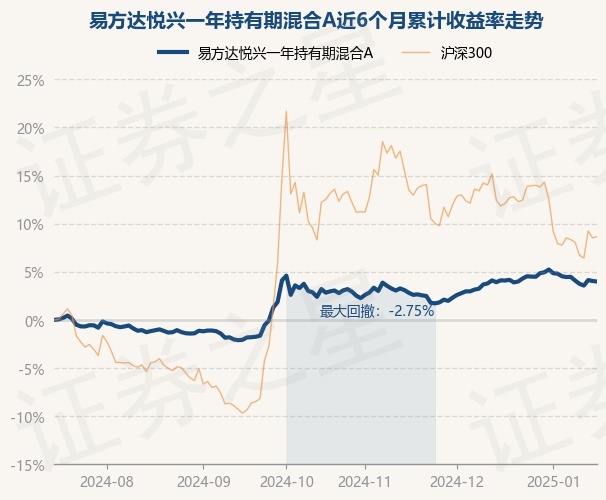 证券之星消息,1月16日,易方达悦兴一年持有期混合A最新单位净值为1.0347元,累计净值为1.0347元,较前一交易日下跌0.05%。历史数据显示该基金近1个月下跌0.12%,近3个月上涨1.09%,近6个月上涨3.99%,近1年上涨7.97%。该基金近6个月的累计收益率走势如下图: