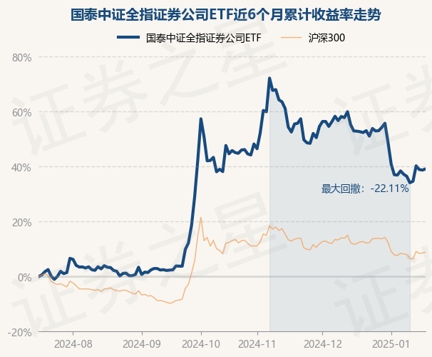 证券之星消息,1月17日,国泰中证全指证券公司ETF最新单位净值为1.0935元,累计净值为1.0935元,较前一交易日上涨0.29%。历史数据显示该基金近1个月下跌9.0%,近3个月上涨0.69%,近6个月上涨39.12%,近1年上涨29.39%。该基金近6个月的累计收益率走势如下图: