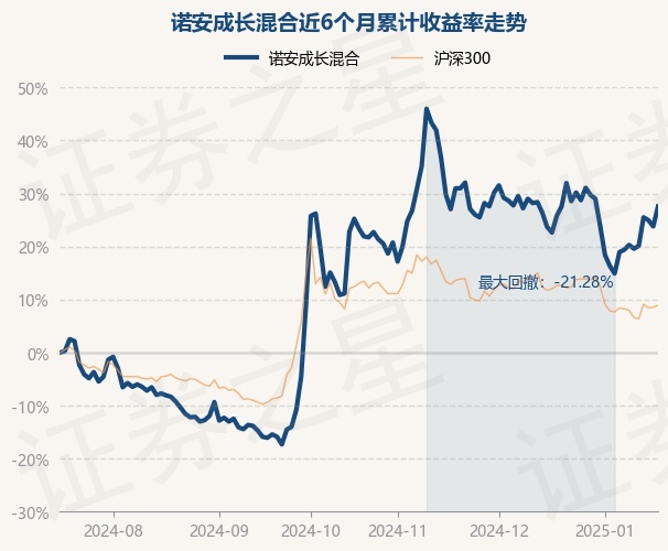 证券之星消息,1月17日,诺安成长混合最新单位净值为1.421元,累计净值为1.866元,较前一交易日上涨3.05%。历史数据显示该基金近1个月上涨4.03%,近3个月上涨14.78%,近6个月上涨27.56%,近1年上涨31.45%。该基金近6个月的累计收益率走势如下图: